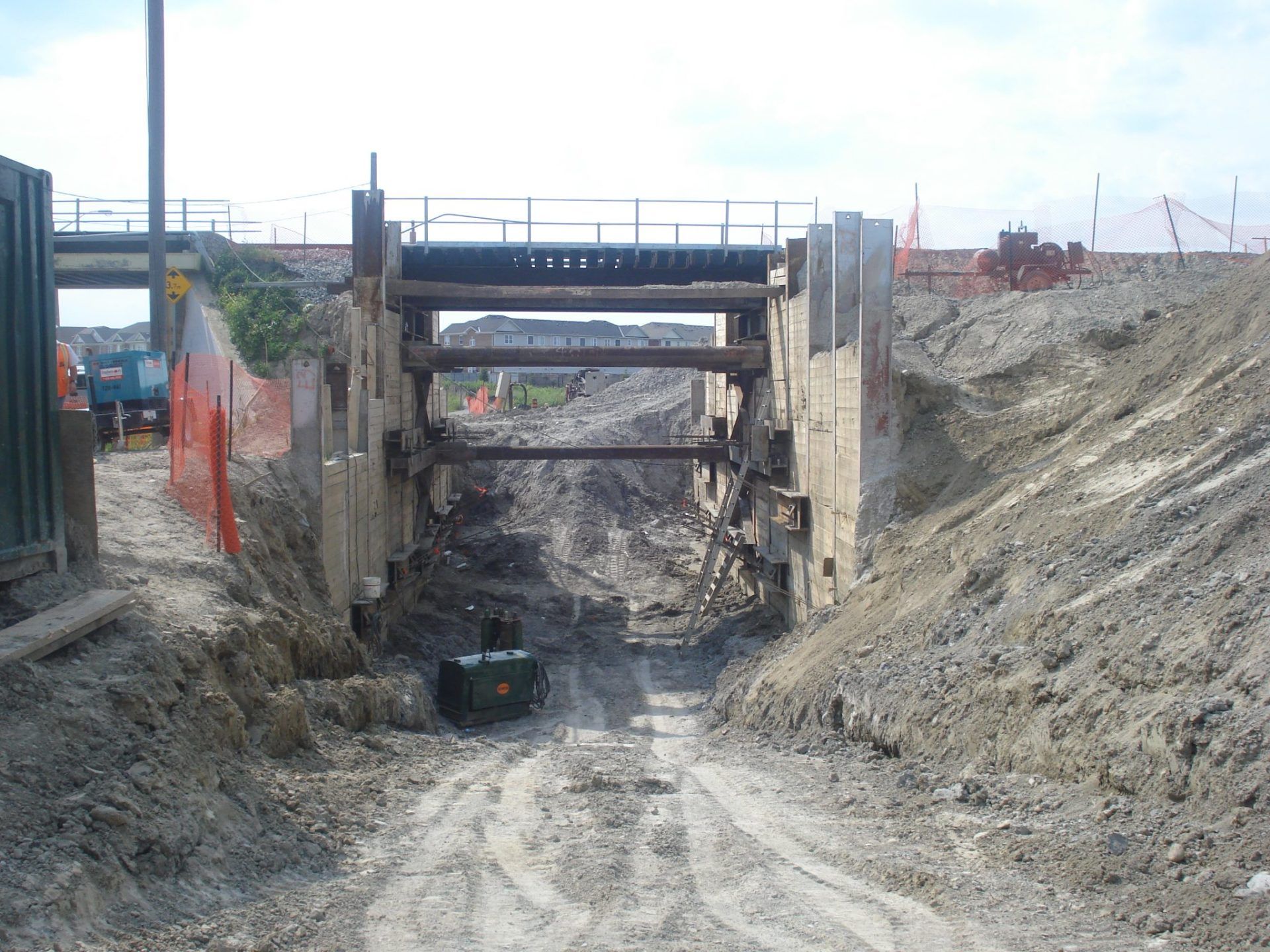 In order to support the staging necessary to keep both the CPR tracks and Morningside Ave. open throughout construction, an 8 metre track protection shoring supporting parts of track loading were designed by Tarra Engineering.